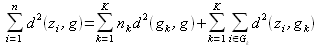 Cette formule décompose la somme des carrés totale (distance entre les individus d'origine et le centre de gravité g, quantité constante et ne dépendant pas de la partition) en la somme de la somme des carrés inter-classes qui correspond à la somme des distances des centres de gravité de chaque groupe au centre de gravité du nuage et la somme des somme des carrés intra-classes qui correspond à la somme des distances de chaque individu au centre de gravité de son groupe.