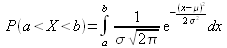 Prenons X une v.a. suivant une loi normale N (μ, σ). Nous aurons peut être besoin de calculer la probabilité que X prenne une valeur donnée dans un intervalle [a, b] (cela pourrait être la tranche de revenus de personnes ciblées par une vente, ou encore la gamme de pointure de chaussure que l'on veut conserver en stock).