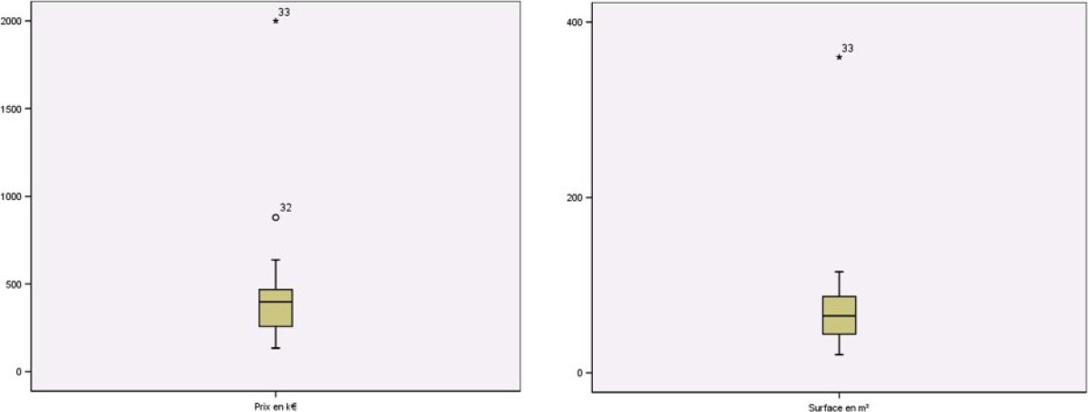 On cherche à étudier le prix des appartements du 19° arrondissement en fonction de leurs surfaces. Pour cela, on dispose d'un échantillon de 33 appartements dont on connaît le prix et la surface.