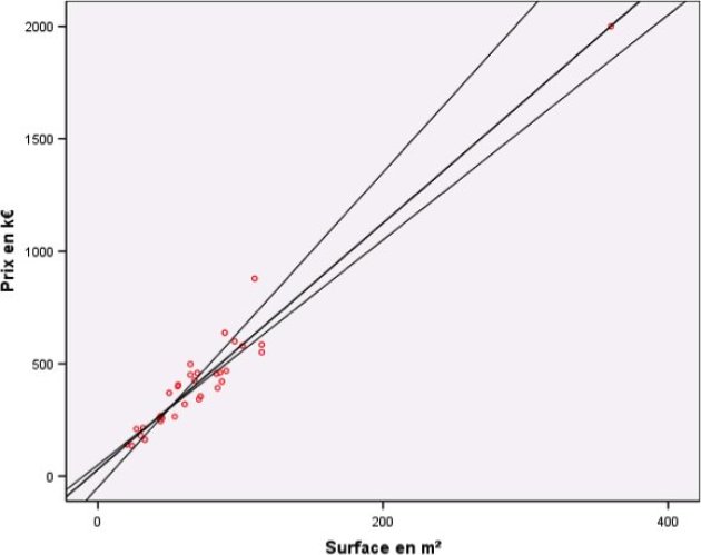 Comme on peut le voir sur le graphique, il est impossible de trouver des coefficients b0 et b1 pour avoir un modèle Prix=b0+b1Surface.