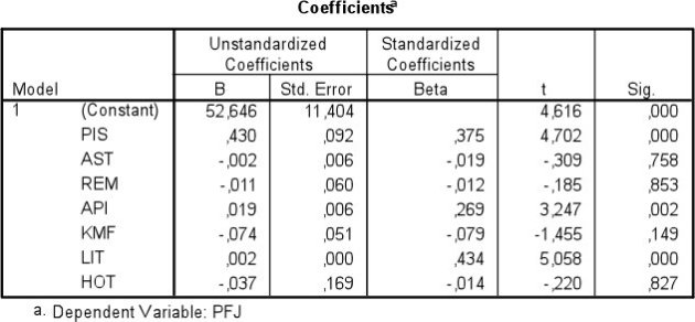 = 52.6459 + 0.4302PIS - 0.002AST -0.0111REM + 0.0189API + -0.0740KMF + 0.0016LIT - 0.0371HOT
