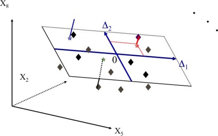 On peut également avoir une approche géométrique pour illustrer l'analyse factorielle (approche liée à l'analyse en composantes principales, ACP).