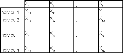 Comme on effectue un nuage de points lorsque nous sommes en présence de deux variables (l'une en abscisse, l'autre en ordonnées), imaginons que l'on crée un axe pour chacune des variables d'origine. Il y aura donc p axes. Plaçons maintenant les n individus dans cet espace à p dimensions.